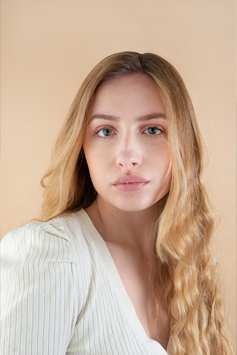 J’ai voulu créer une harmonie subtile entre le blond des cheveux d’Anaïs et le fond beige, pour que couleurs et textures dialoguent avec élégance.